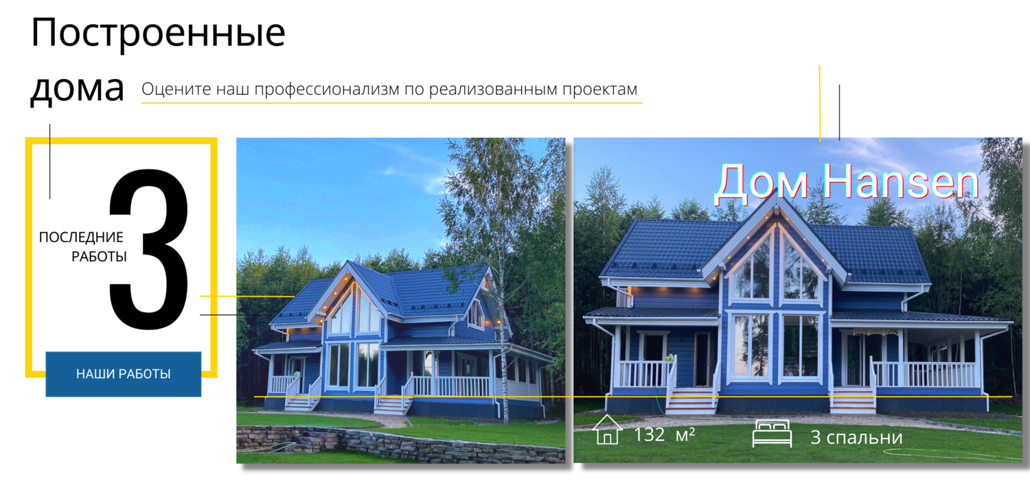 Дом в скандинавскои стиле построенный по проекту Hansen в 2020г. Общей площадью 152 м² с тремя спальными. Жилой площадью 132 м². Габариты дома 13 x 7,8 м. Дом был построен в комплектации под ключ, так же нашей компанией на участке были выполнены ландшафтные работы